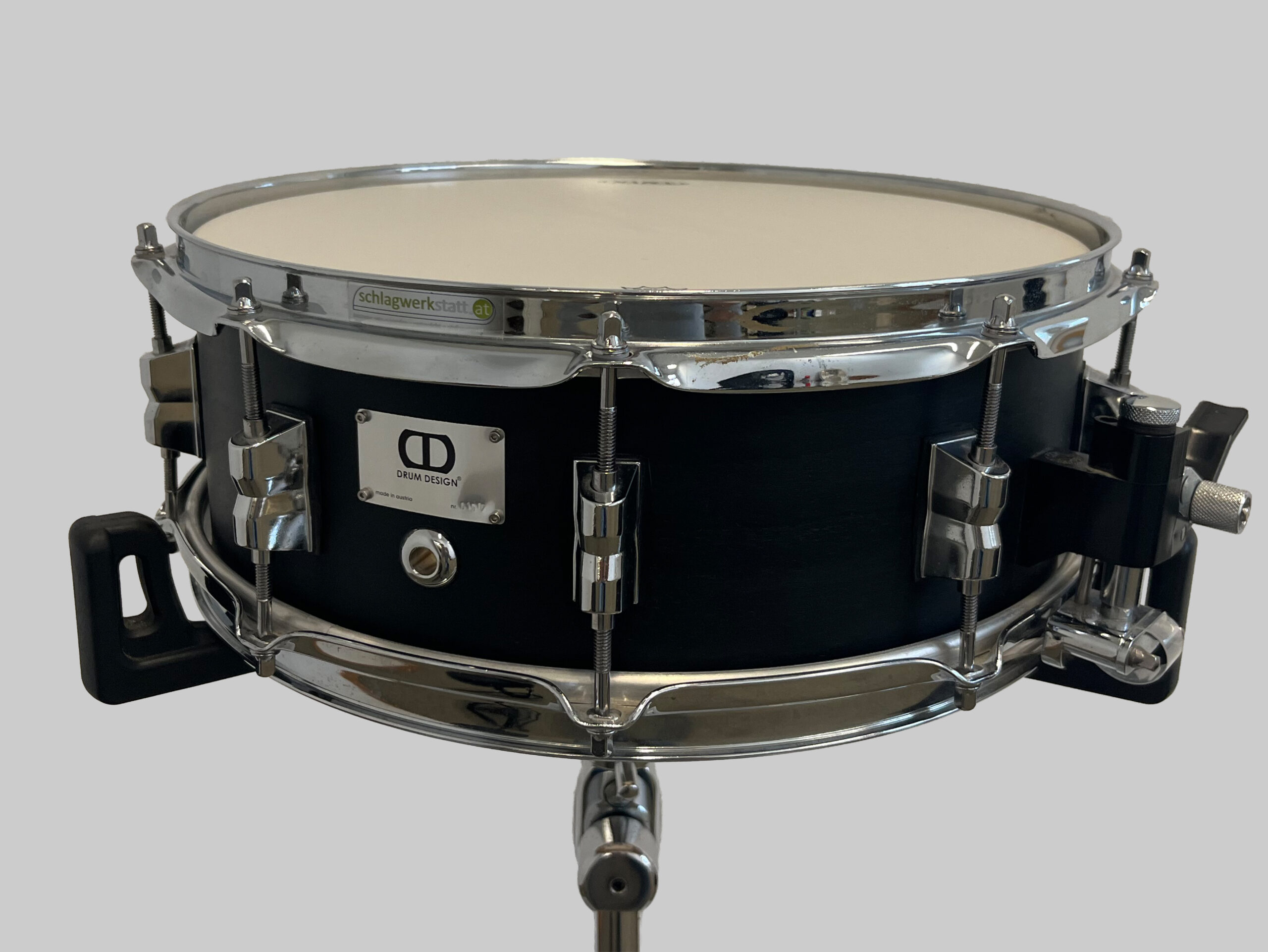 Custom-Snaredrum aus der DrumDesign Classic Serie. Kessel 100% Maple, Finish Satin Oil Black, 2,3mm Power Hoops, Nickel Snarestrainer. Herstgestellt 2010 in Österreich.